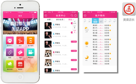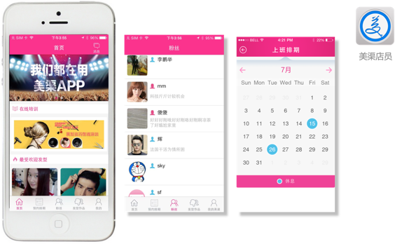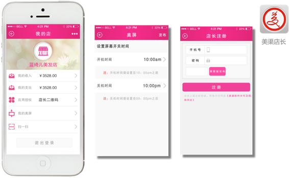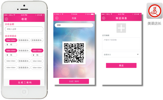 美渠产品含“美渠一体机”、“美渠APP”和“美渠电商”三大部分,多角度、全方位服务于美发店与客户。其中,置于店内的“美渠一体机”以极具人性化的科技手段,完美实现了娱乐互动、安防监控、店家培训、广告传播等功能;安装于手机的“美渠APP”软件专业为客户服务,精致地实现远程监控、发型互动、娱乐社交及顾客管理、美发预约、远程付款、财务结算和服务点评等;美渠电商专为厂家开拓渠道、店家一站式采购与销售、顾客一站式购买等服务。