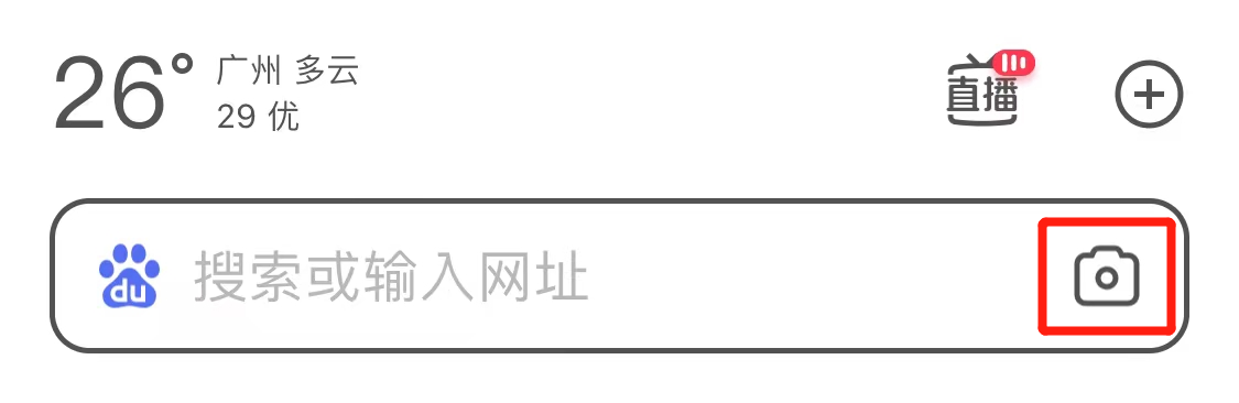 用百度App举例,打开应用,搜索框右方有个类似摄像机的图标,点击一下,即可拍照或从相册选取图片搜索。