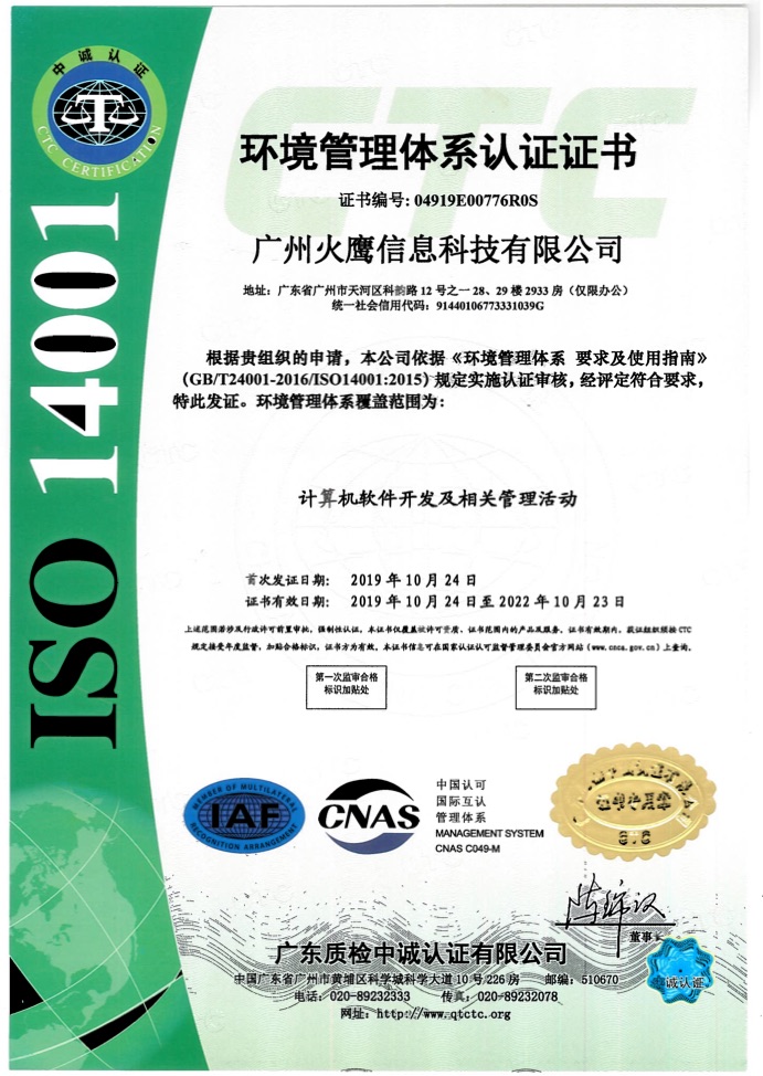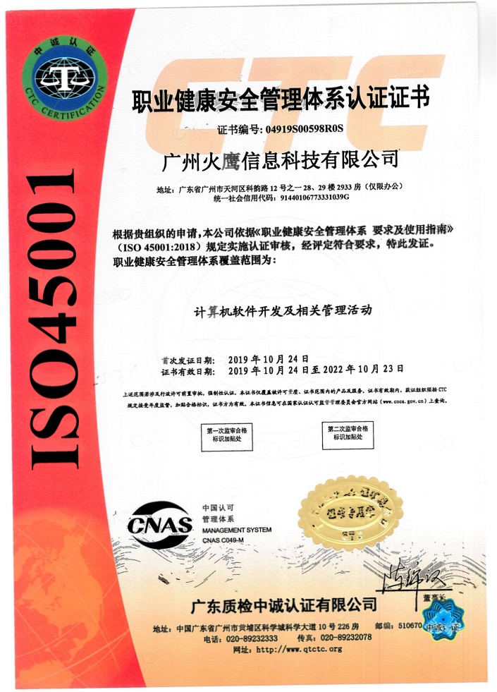 时间:时间: 2019-10-15 15:18:43 阅读: 次分类:公司动态ISO9000族标准由国际标准化组织(ISO)制定,是现代质量管理和质量保证的结晶,它提供了建立质量体系的基本要求,也是企业进行质量管理的基本要求。按ISO9000族标准建立的质量体系能发挥企业质量管理的实际功效,同时也为顾客和第三方认可打好基础,提供认可。项目质量是企业生存的关键,影响项目交付质量的因素很多,单纯依靠测试只不过是从研发的项目中改进到合格的版本,这就不可能以最佳成本持续稳定地实施项目工作。质量管理是在整个质量体系中运作的,所以实施质量管理必须建立质量体系。为了降低企业的各种管理成本和损失成本,提高效率,为客户和潜在客户提供信心,火鹰科技公司向国家申请了ISO45001(职业健康安全管理体系)、ISO9001(质量管理体系认证)、ISO14001(环境管理体系认证)管理体系认证中三项关键性认证,这标志着火鹰科技公司除了CMMI-3(国际软件能力成熟度自定义级认证)、国家高新技术企业认证、软件企业认证等资质外的又一关键性资质,给政府部门、大型企业提供更好的实力证明,同时也是火鹰公司内部更加规范化管理的标志: