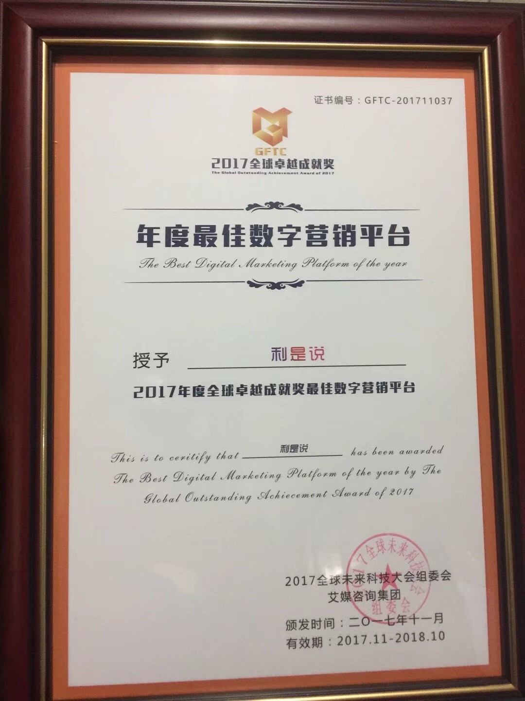 “利是说”斩获“2017年度全球卓越成就奖年度最佳数字营销平台”称号